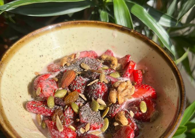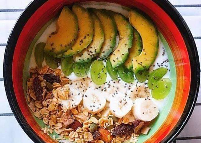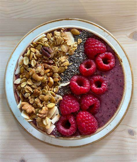 - Granola smoothie bowl: Xay sinh tố trái cây, đổ ra tô, rắc granola lên trên cùng với hạt chia và các loại hạt khác.