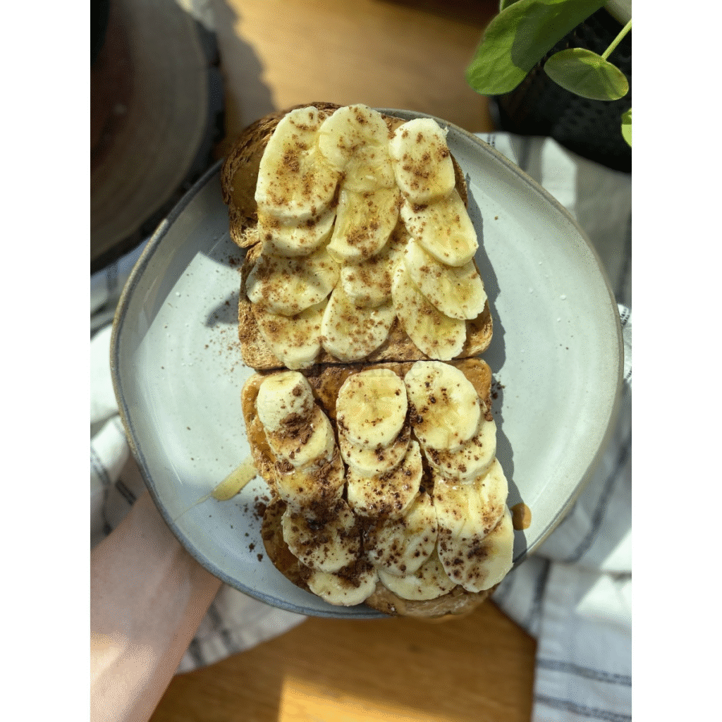 🍌 3. Chuối nướng phết bơ đậu phộng, phủ granola